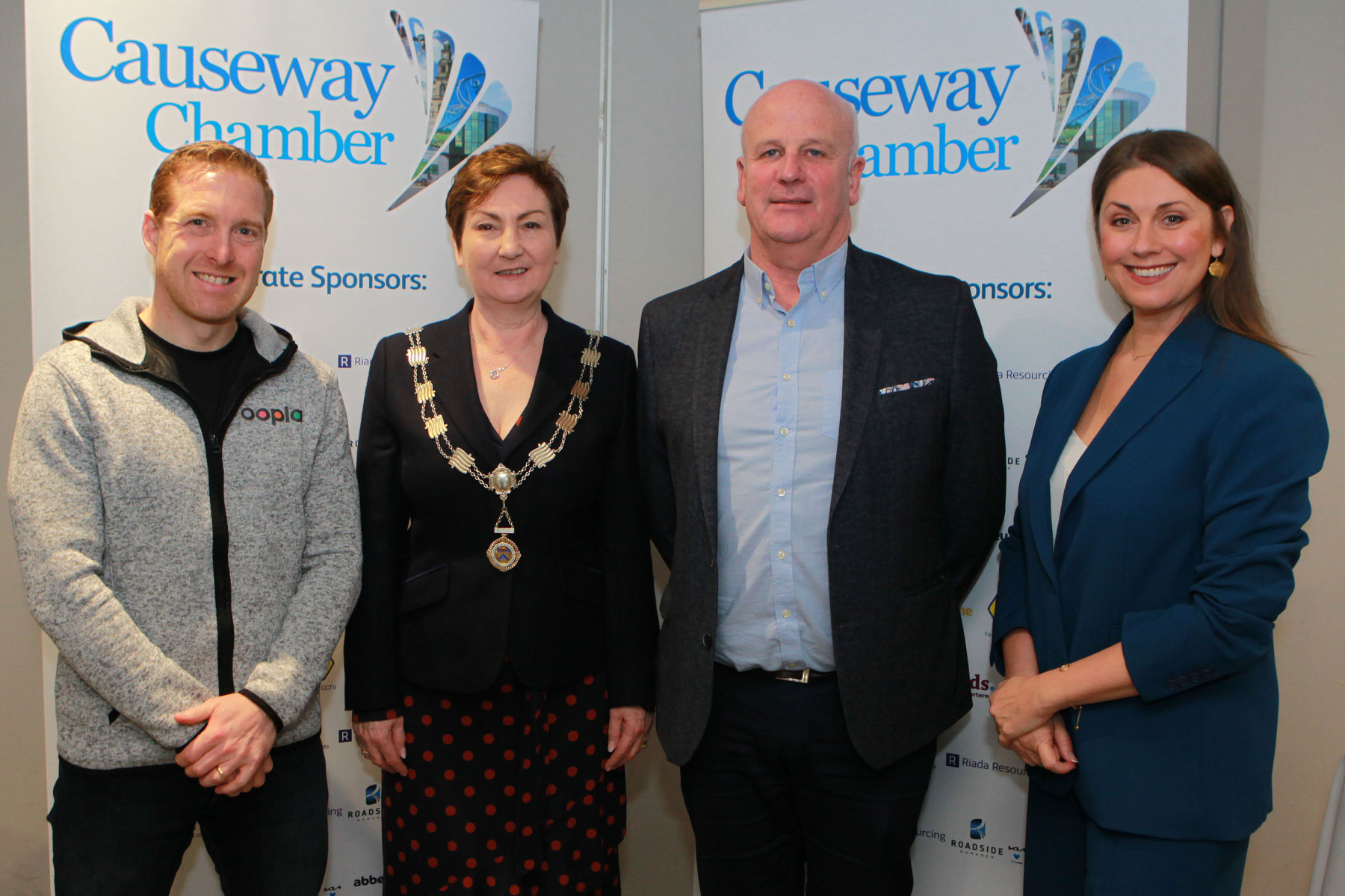 Guest speakers with Causeway Chamber of Commerce President Anne Marie McGoldrick are Dr Jonny Bloomfield Health and Performance Coach and Paddy McLaughlin RNLI Coxswain at Cushendall with host Sarah Travers.